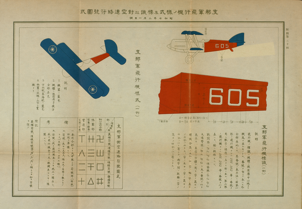 Caption on back: 第十六卷附圖第三十四支那軍飛行機ノ樣式及標識竝對空連絡符號圖式 昭和七年二月一日