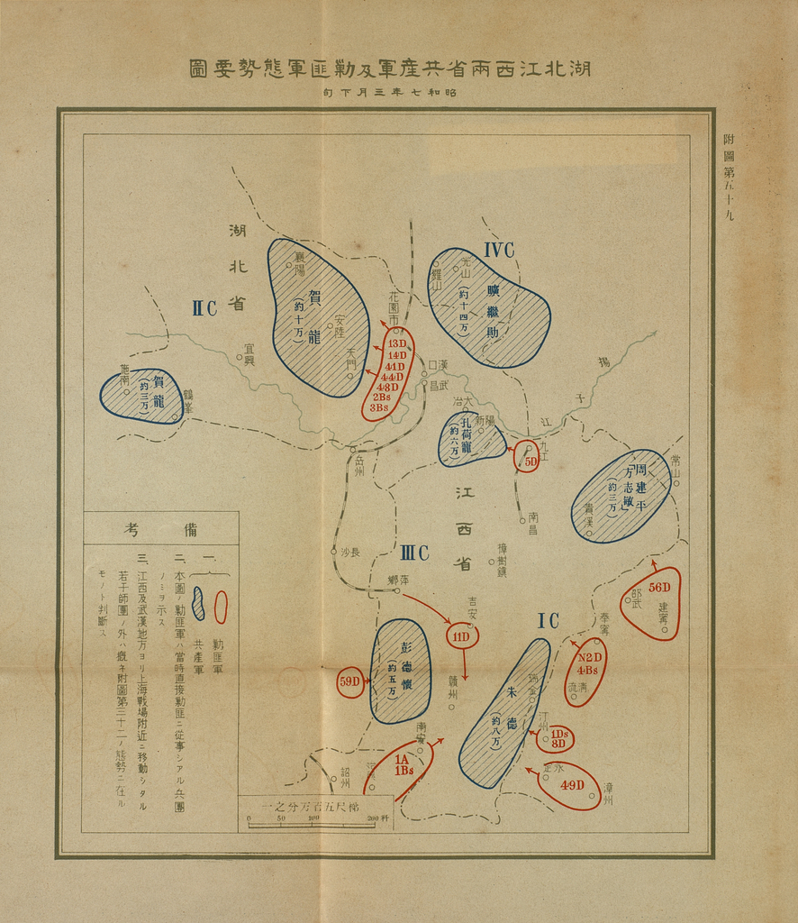 Caption on back: 第十六卷附圖第五十九湖北講習兩省共產軍及巢匪軍態勢要圖 昭和七年三月下旬