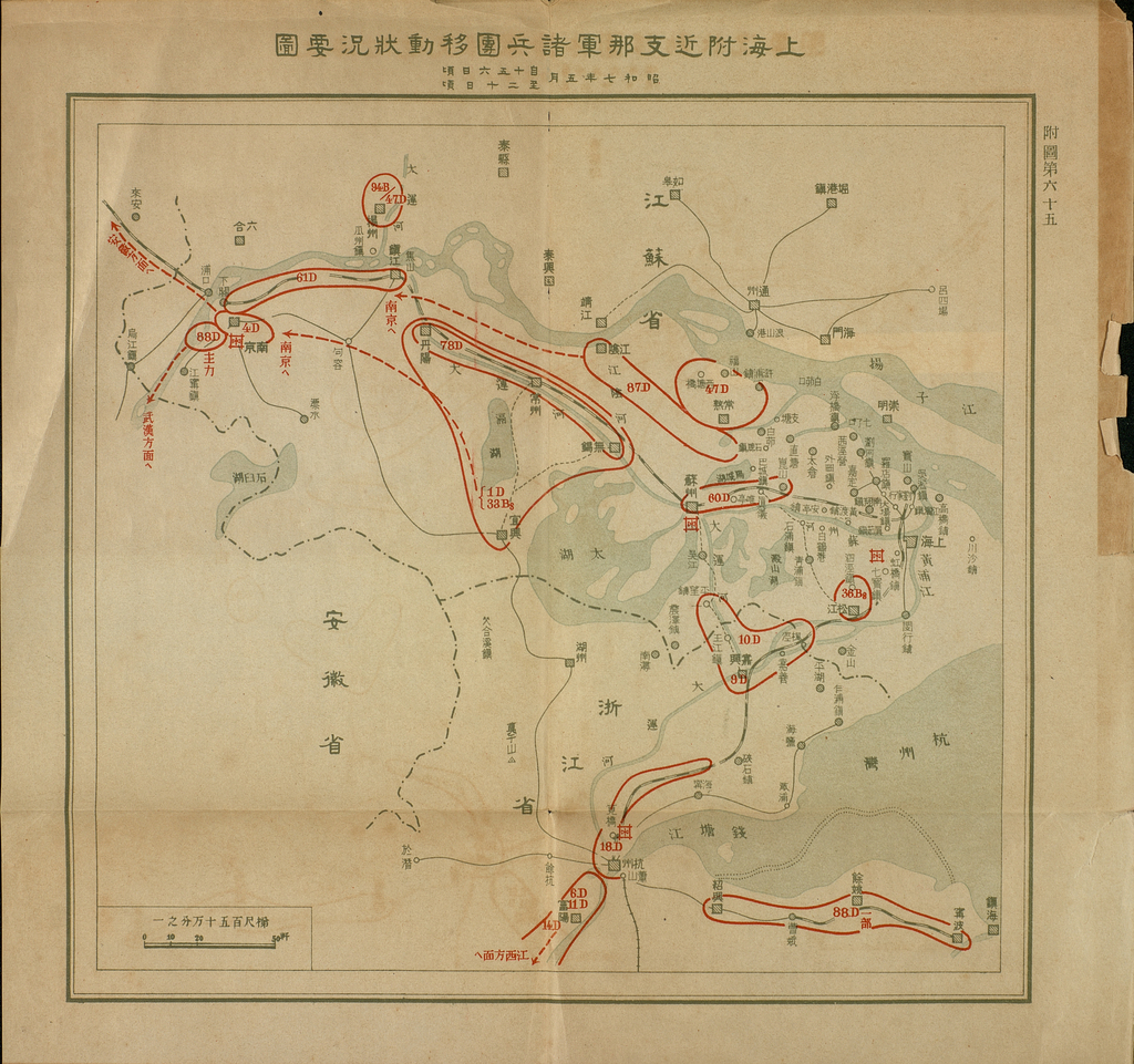 Caption on back: 第十六卷附圖第六十五上海附近支那軍諸兵團移動狀況要圖 昭和七年五月自十五六日至二十日