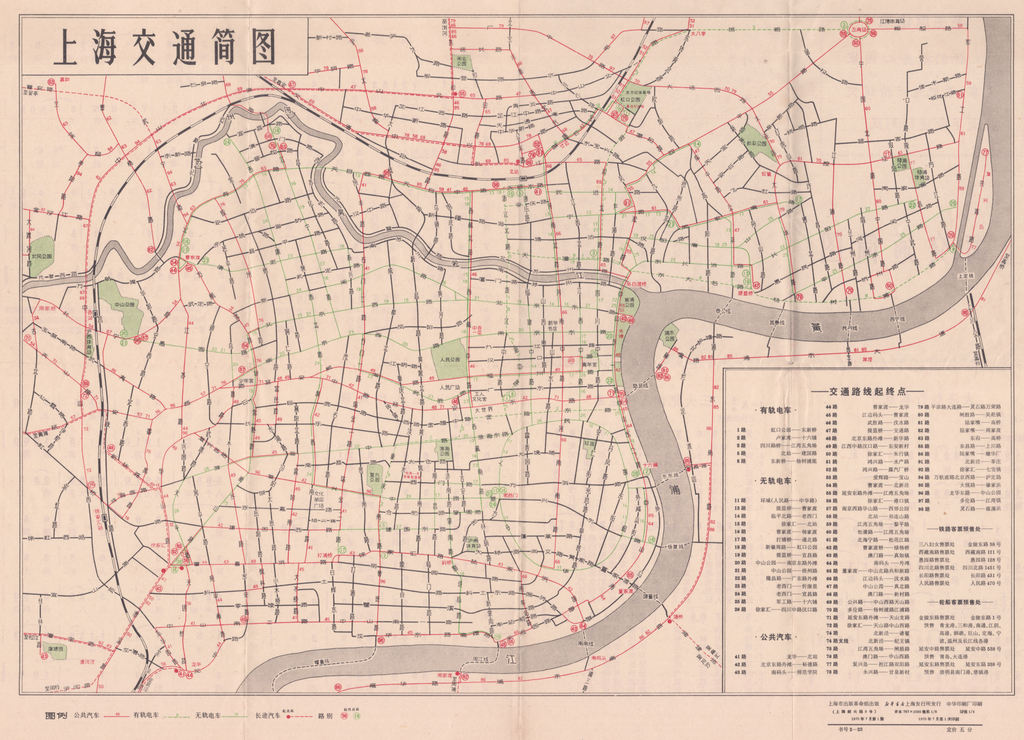 Comments : This is a sketch map for visitors in Shanghai. It provides only the bus lines and the names of the major streets. The map is highly deformed in terms of scale. Another feature is a quotation of Chairman Mao (毛主席語錄) on the back of the map, a regular feature on many documents of that period. On this 1970 edition (see also 1974 [ID639]and 1976 [ID638]), the back side carries the lyrics of several revolutionary songs: The Orient is Red (東方紅), the Internationale (國際歌), etc.