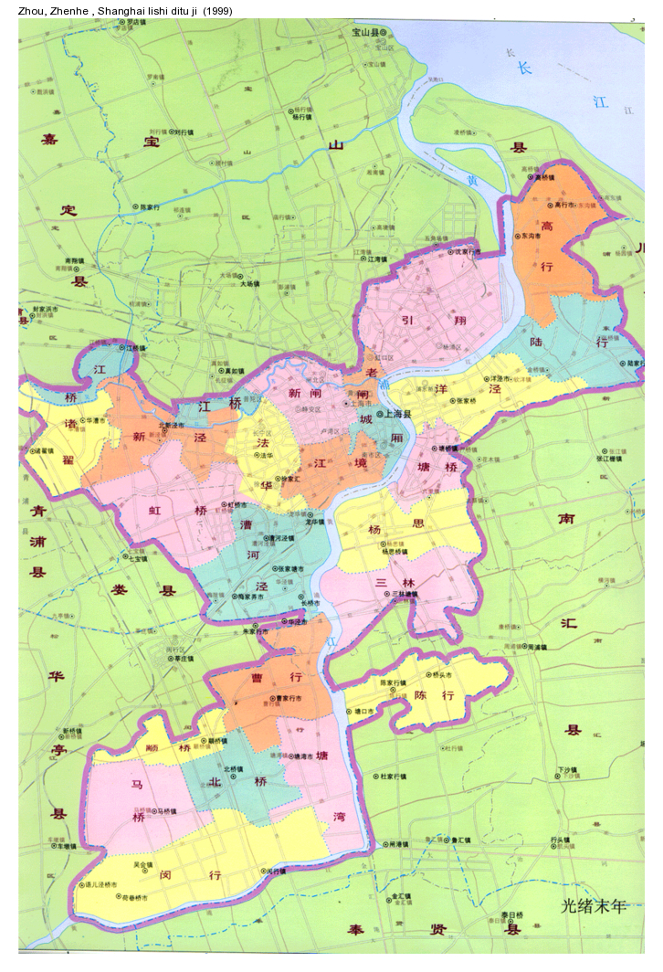 Comments : This map is presented on the web site of the Minhang Municipal Library (上海市閔行圖書館). It was actually digitized from the Shanghai Historical Atlas (Zhou Zhenhe 周振鹤, Shanghai lishi ditu ji 上海历史地图集, Shanghai, Shanghai renmin chubanshe 上海人民出版社, 1999). It is part of a complete set of digitized map on Shanghai from 201BC to 2002AD.