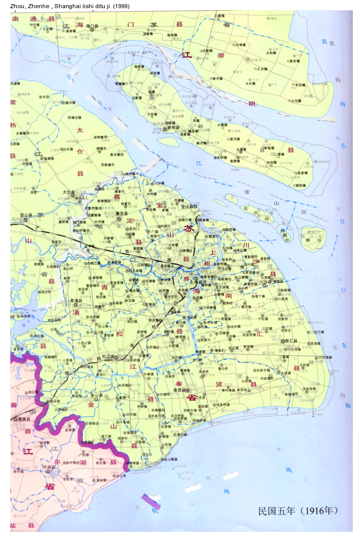 Comments : This map is presented on the web site of the Minhang Municipal Library (上海市閔行圖書館). It was actually digitized from the Shanghai Historical Atlas (Zhou Zhenhe 周振鹤, Shanghai lishi ditu ji 上海历史地图集, Shanghai, Shanghai renmin chubanshe 上海人民出版社, 1999). It is part of a complete set of digitized map on Shanghai from 201BC to 2002AD.