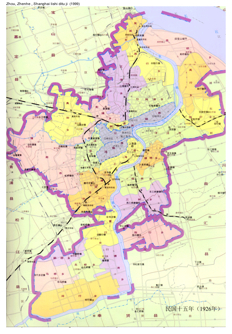 Comments : This map is presented on the web site of the Minhang Municipal Library (上海市閔行圖書館). It was actually digitized from the Shanghai Historical Atlas (Zhou Zhenhe 周振鹤, Shanghai lishi ditu ji 上海历史地图集, Shanghai, Shanghai renmin chubanshe 上海人民出版社, 1999). It is part of a complete set of digitized map on Shanghai from 201BC to 2002AD.
