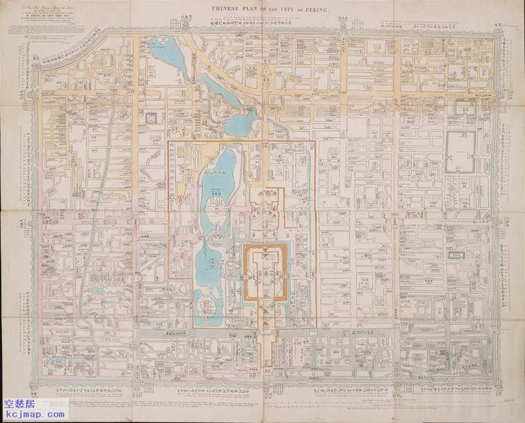 Inscription on map: CHINESE PLAN OF THE CITY OF PEKING. To Her Most Gracious Majesty the Queen, THIS FAC-SIMILE OF A CHINESE PLAN of the Tatar, or inner City, Nuyching, and the Imperial Palace Kingtoo OF PEKING, OR CHUN THIEN FOO, The Northern Residence of the Court, or Capital of the Chinese Empire, is most respectfully inscribed, with Her Majesty's most gracious permission, by Her Majesty's faithful Servant. T.B.JERVIS.