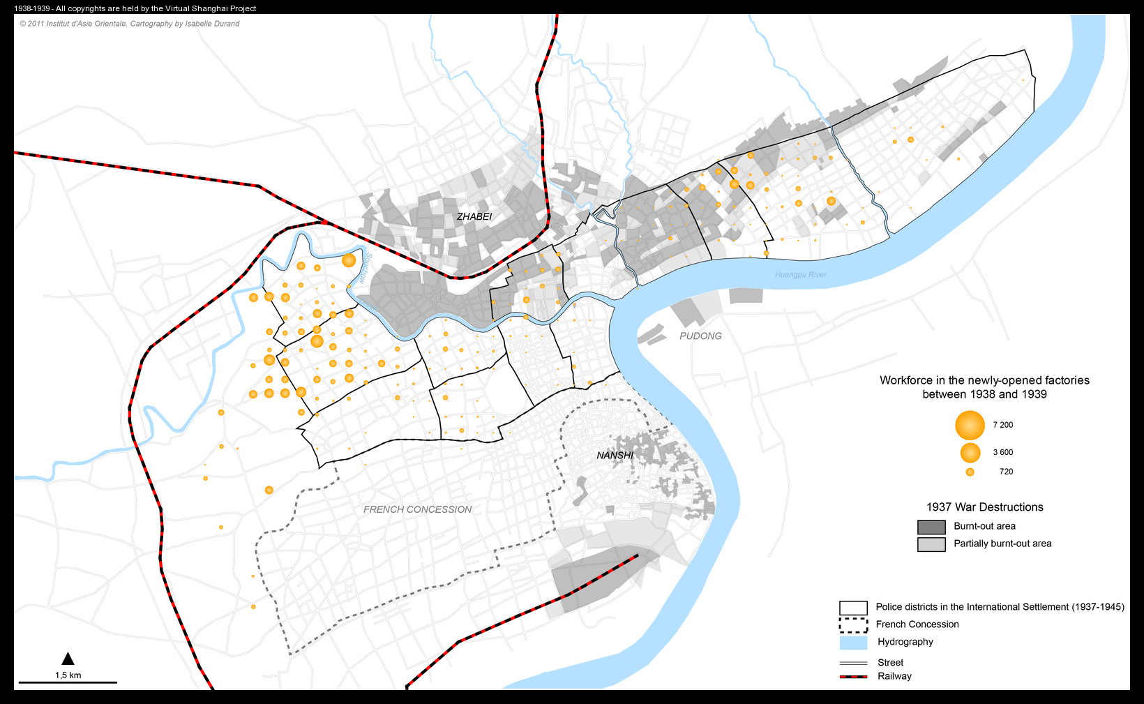 Comments : These maps show the impact of war on factories in the International Settlement. They document where and with what workforce factories opened after the conflict of August-November 1937. They are based on the July 1936, July 1938, and July 1939 surveys by the Shanghai Municipal Police. The 1937 survey is currently missing. These maps belong to a series that document the changing geography of industry in Shanghai between 1936 and 1940. It is also related to a more general study of industries in the International Settlement from 1930 onward.