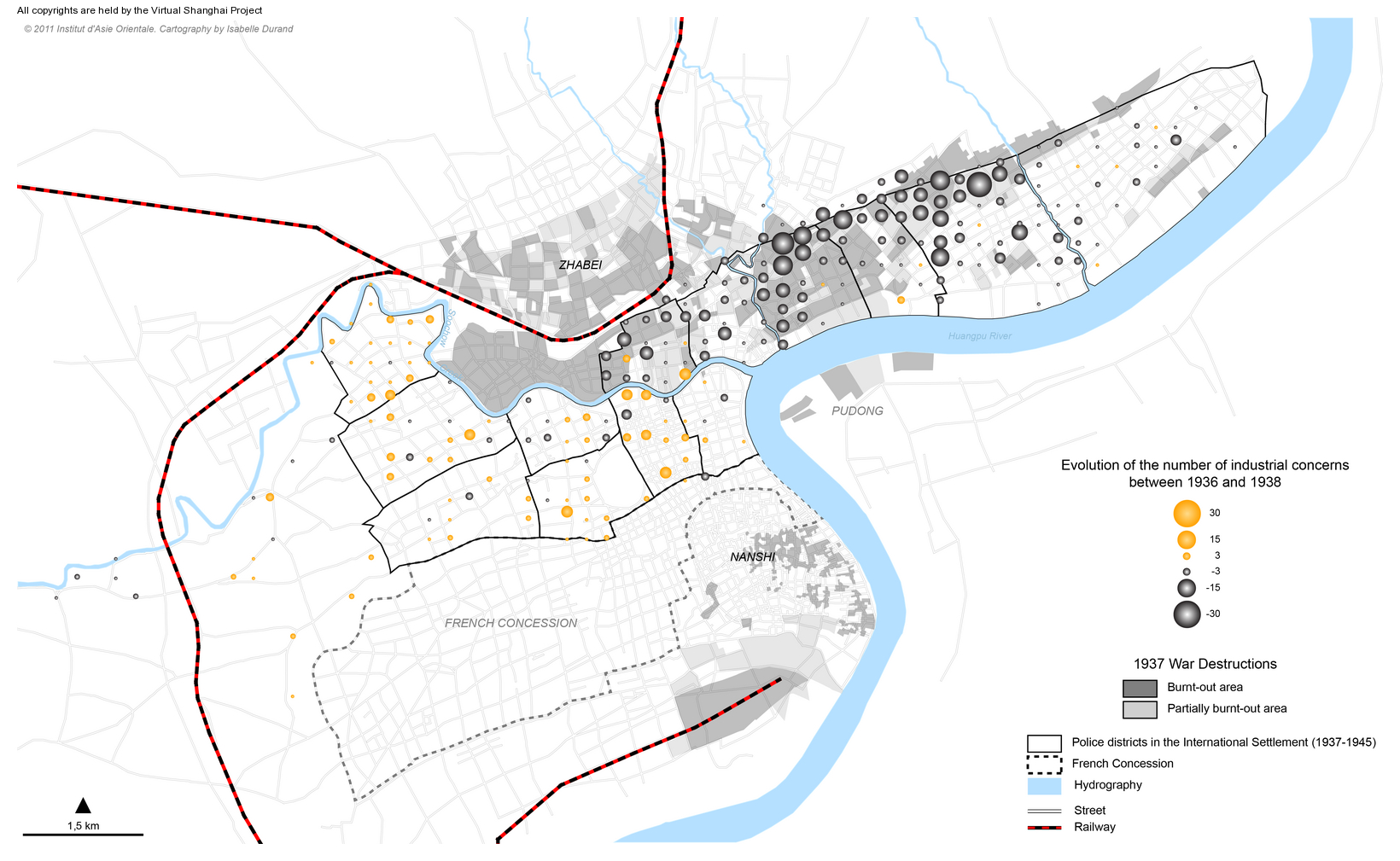 Comments : This map shows the impact of war on factories in the International Settlement. It is based on the July 1936 and July 1938 surveys by the Shanghai Municipal Police. The 1937 survey is currently missing. This map provides a view of how many factories disappeared or were established between the two dates, and where they were located in relation with the areas that were destroyed by bombings and fires during the Sino-Japanese hostilities of August-November 1937. This map belongs to a series that document the changing geography of industry in Shanghai between 1936 and 1940. It is also related to a more general study of industries in the International Settlement from 1930 onward.